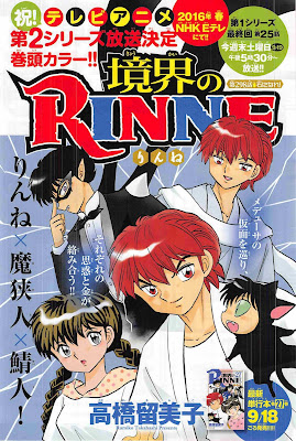 Na capa a garota bonita da vez foi Mai Shiraishi, que faz parte da banda Nogizaka46. A principal color page foi para Kyoukai no Rinne, um dos mangás mais importantes da revista e que vai ganhar segunda temporada em anime em breve.